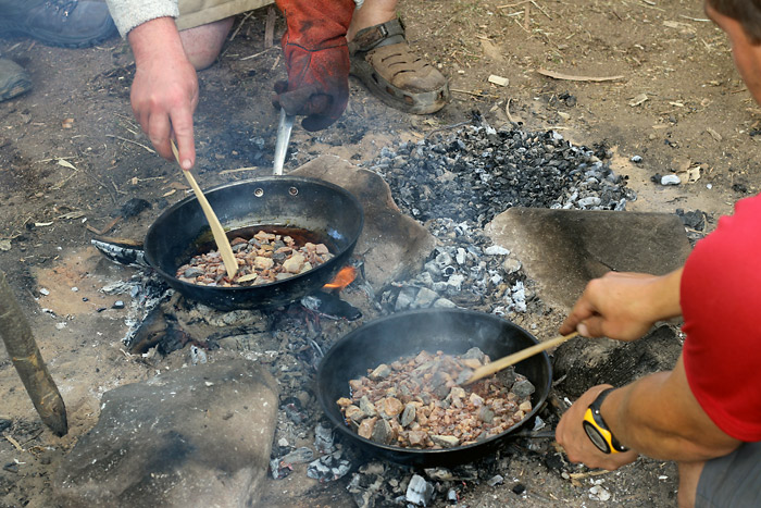 It was then a case of sealing any gaps to make the craft watertight, using a technique known as gumming. A mixture of fat and spruce resin was heated over the campfire, until a rich brown liquid was produced. This was then applied liberally to all the seams and holes created in the building of the canoe.