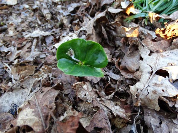 Answer: It looks like a beech seedling to me; often the first two leaves a seed puts out are quite different to those of the plant it grows into which makes ID tricky. Some tree ID books show pictures of the ‘seed leaves’, a few (particularly beech) are quite surprising!