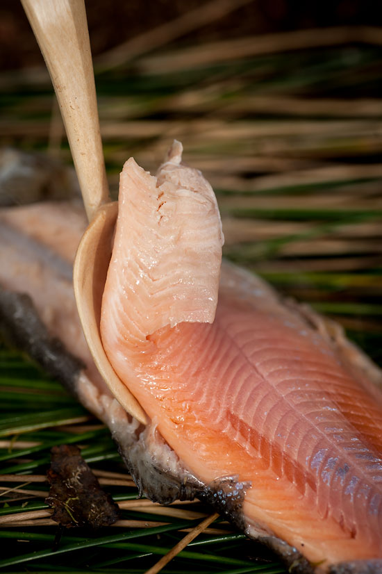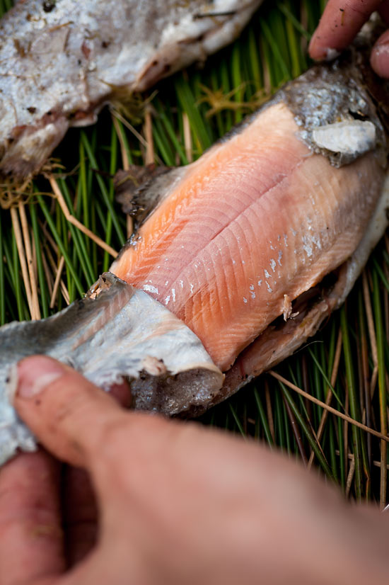 9. Remove the fish from the fire and peel away the rest of the skin. Spoon the flesh away from the bone.